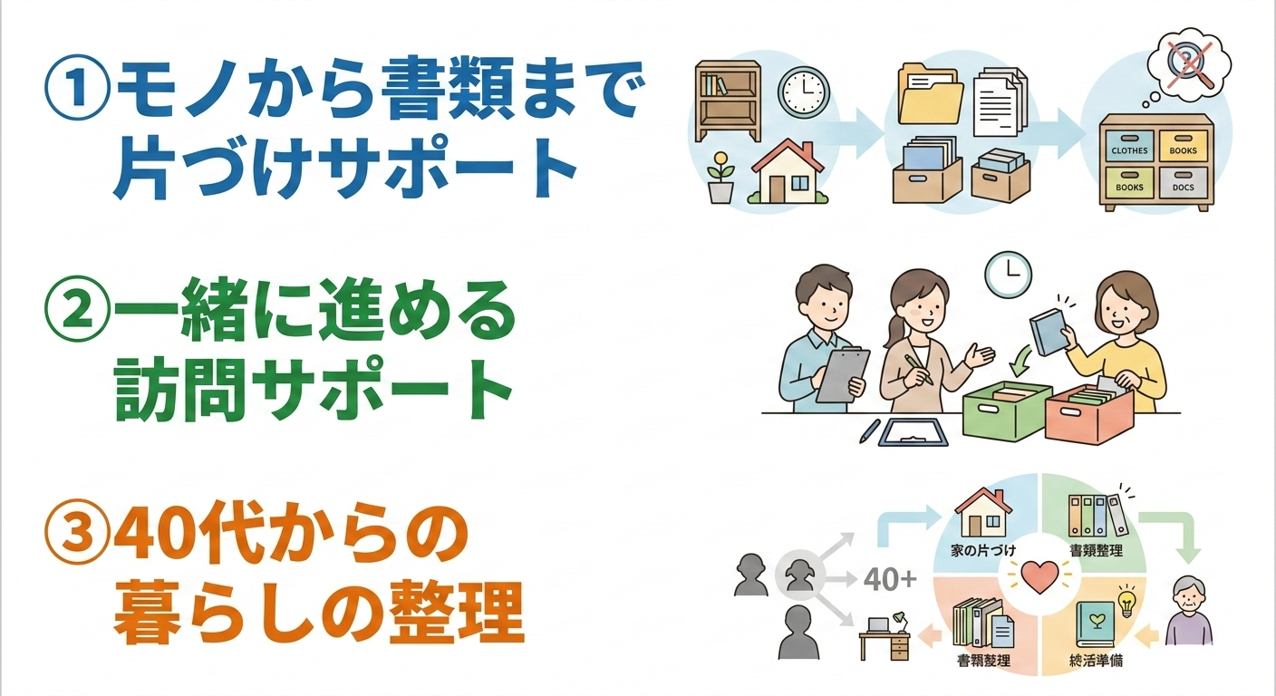 書類やモノの整理が苦手な方でも、安心して進められるように丁寧に確実にサポートします。