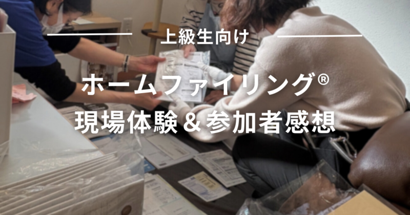 ホームファイリング®作成サポートの場を上級生向け勉強会(現場体験)としてご提供いただきました。遠方からご参加くださった方もいらっしゃり、本当にありがとうございました。 ホームファイリング®サービス開始当初の戸惑い ホームファイリング®サービス... -